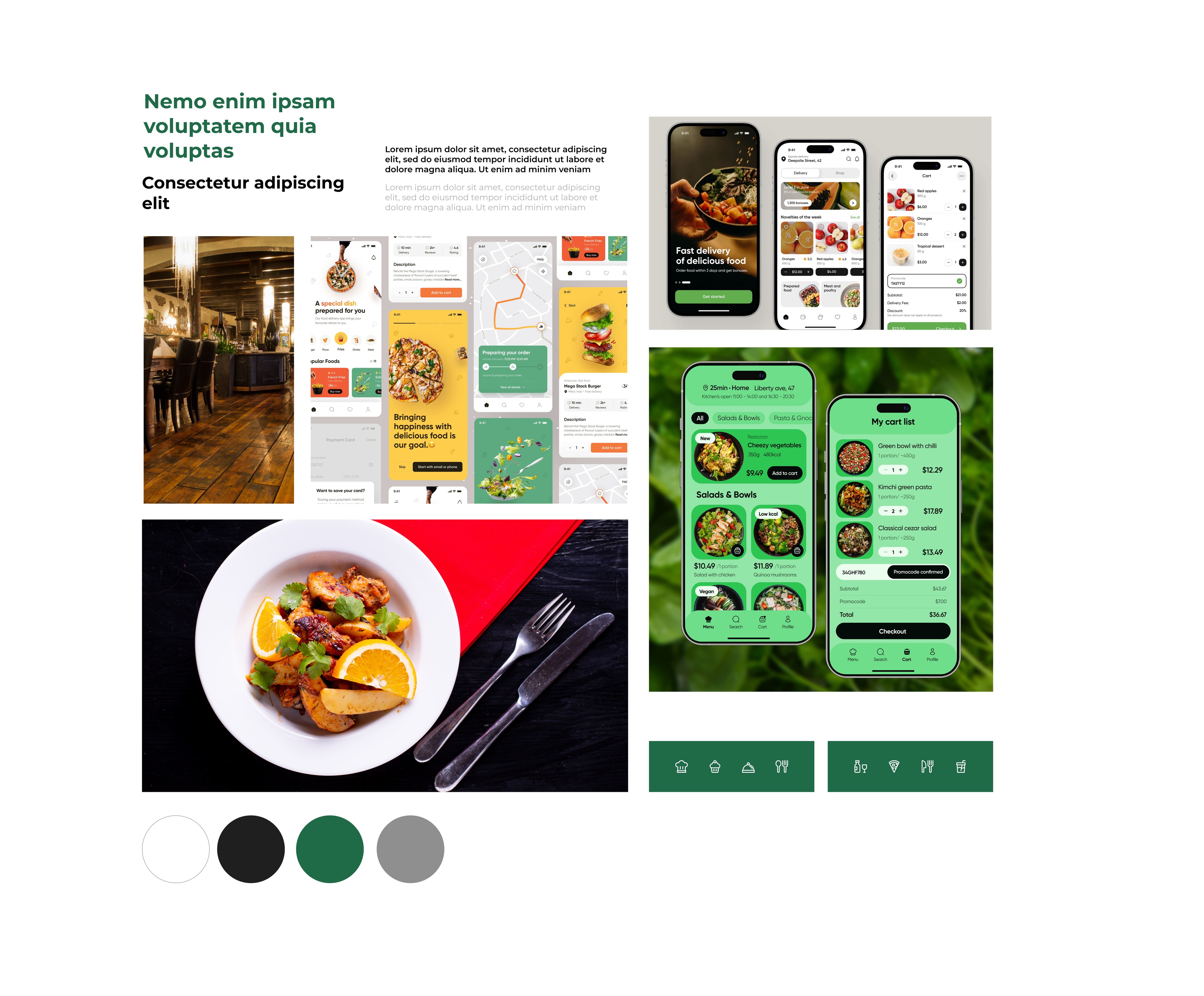 TOur client had always worked with offline products, and none of the restaurants had a consistent style. My task was to design a visual concept that would work for all types of restaurants—from luxury dining to casual food spots. To achieve this, I chose dark, universal colors that fit both ends of the spectrum. I also aimed to create a softer look by incorporating rounded elements in the design. Additionally, I focused on using real photographs to showcase the beauty of the dishes, making the ordering process more appealing to users.