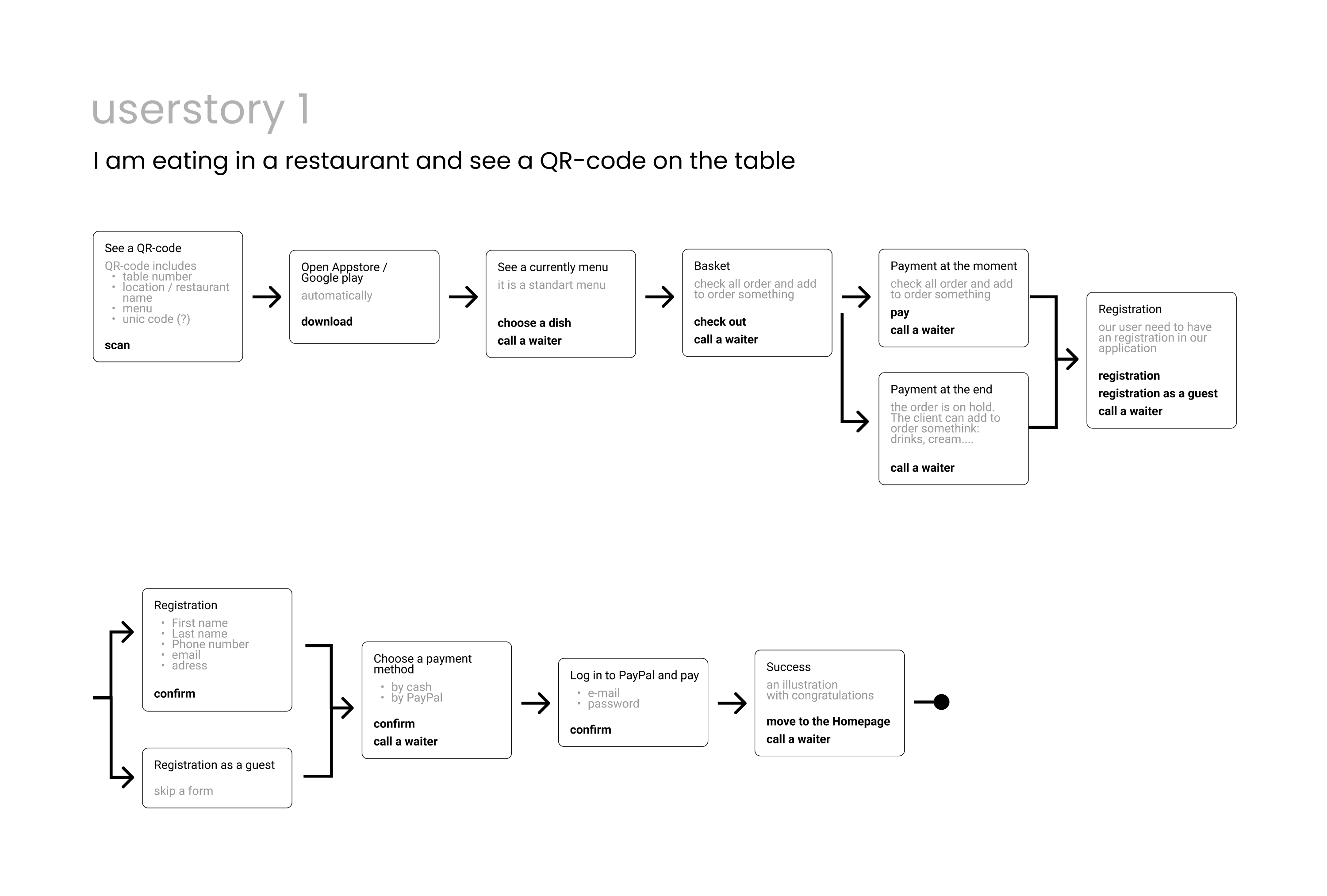 a beautiful menu animation, but interviews revealed that such a menu hindered the ability to navigate back and place more orders, potentially affecting the client's revenue. Another hypothesis was about post-order payment in the app: it posed a risk of customers leaving without paying, yet traditionally, customers pay at the end of their visit in the restaurant. My interviews, conducted with black and white prototypes, helped address these concerns.