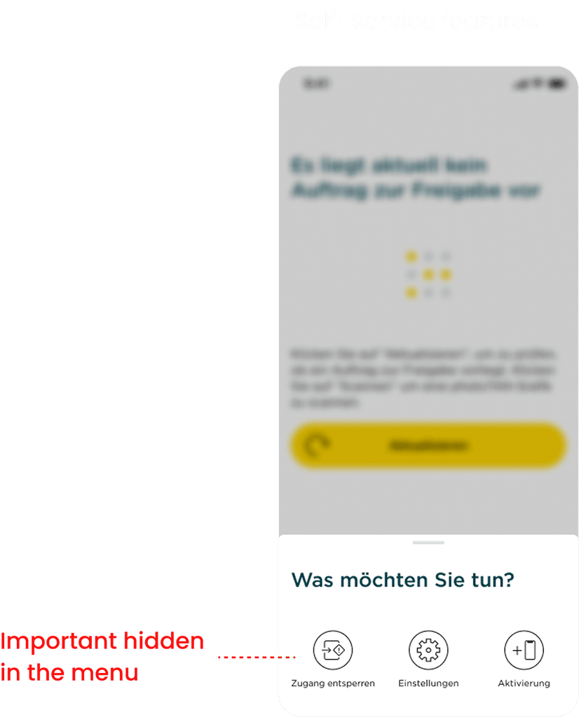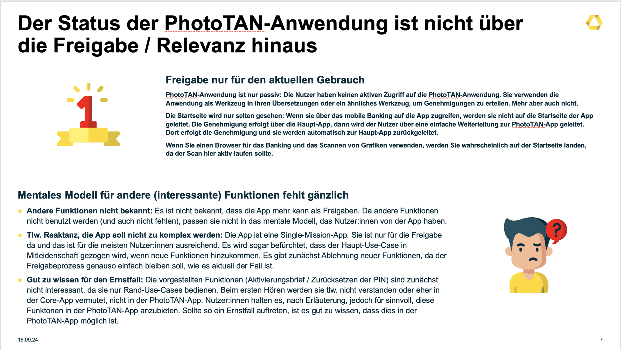 To dive deeper into the project, I needed a clearer understanding of the team’s insights. Since the development team, project managers from both my company and Commerzbank had been working together for a while, I suggested a workshop to assess current challenges and future goals. During the discussion, we uncovered a key hypothesis: many photoTAN users are unaware of the app’s features that can help them in unexpected situations, without needing to contact the bank or support line.