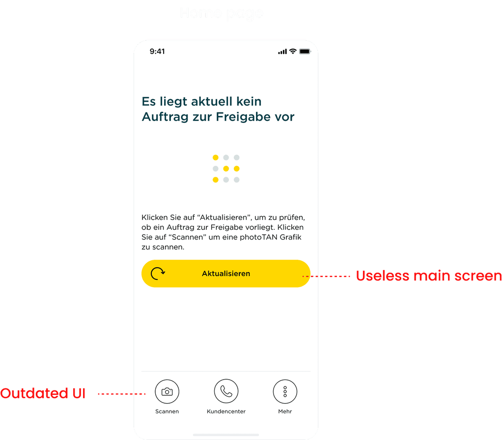 📌 The screenshot shows how photoTAN looked with its outdated design system compared to the bank’s main app. This visual disparity highlighted the need for an update to align with the bank’s current branding.